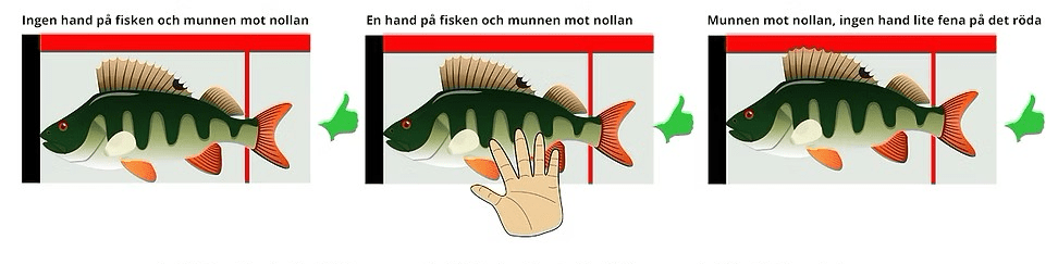 Vi vill se vänster sidan upp på abborren , det röda sträcket längst upp på linjalen får inte täckas av fingrar eller abborren ! försök att ta bra bilder 1 Nr 2 att nosen på abborren är på noll ! Vänta med ett OK från Admin.Sen kan man returnera abborren.